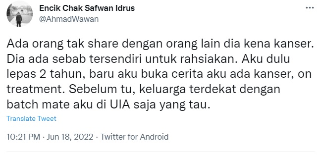 Ada orang tak share dengan orang lain dia kena kanser. Dia ada sebab tersendiri untuk rahsiakan. Aku dulu lepas 2 tahun, baru aku buka cerita aku ada kanser, on treatment. Sebelum tu, keluarga terdekat dengan batch mate aku di UIA saja yang tau.