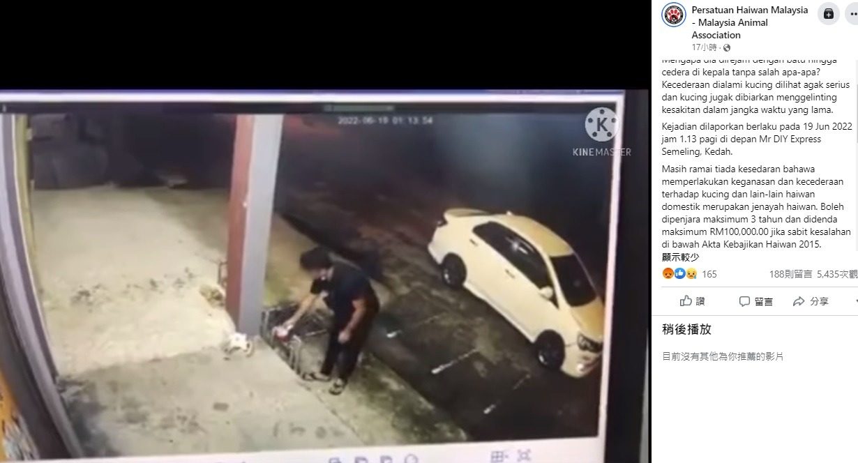 大马动物协会今日在脸书专页上载一段视频,显示一名男子用石头狂丢小猫头部的视频,不少网民留言谴责。