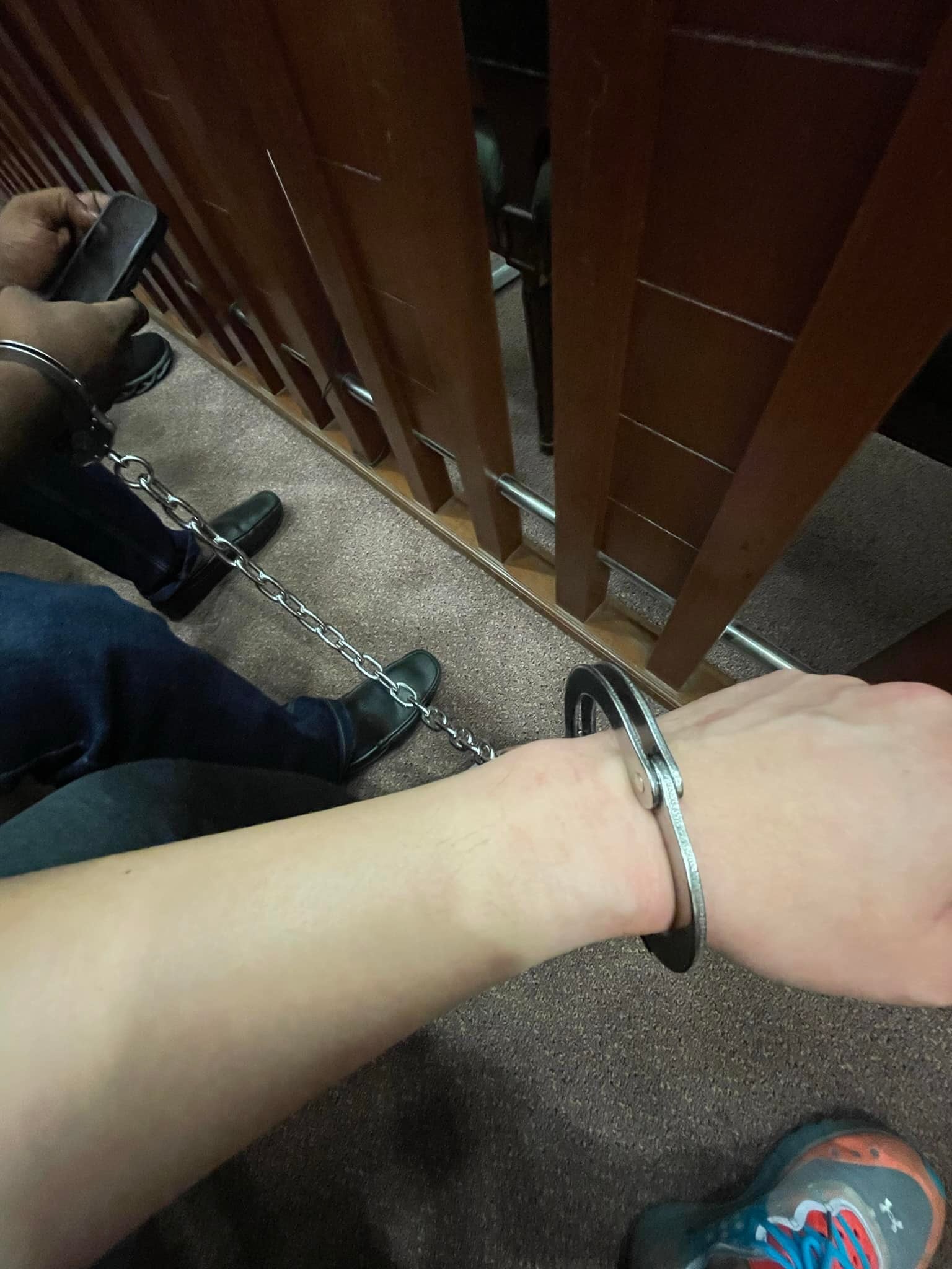 “我被铐上手铐,和其他几个人铐在一起。睡不够,只能坐在椅子,行动也被限制。”