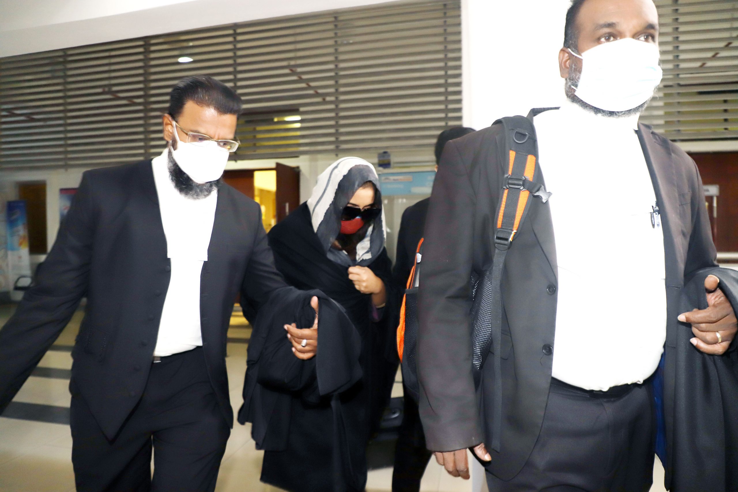 莎米拉今日进出法庭接受最终审讯,都由数名律师护送全程陪同。她在庭外一如既往披头巾罩住全头,且用手紧紧拉住头巾以免掉落,并戴着一个超大墨镜遮住双眼和戴红色口罩,几乎不以真面目示人。