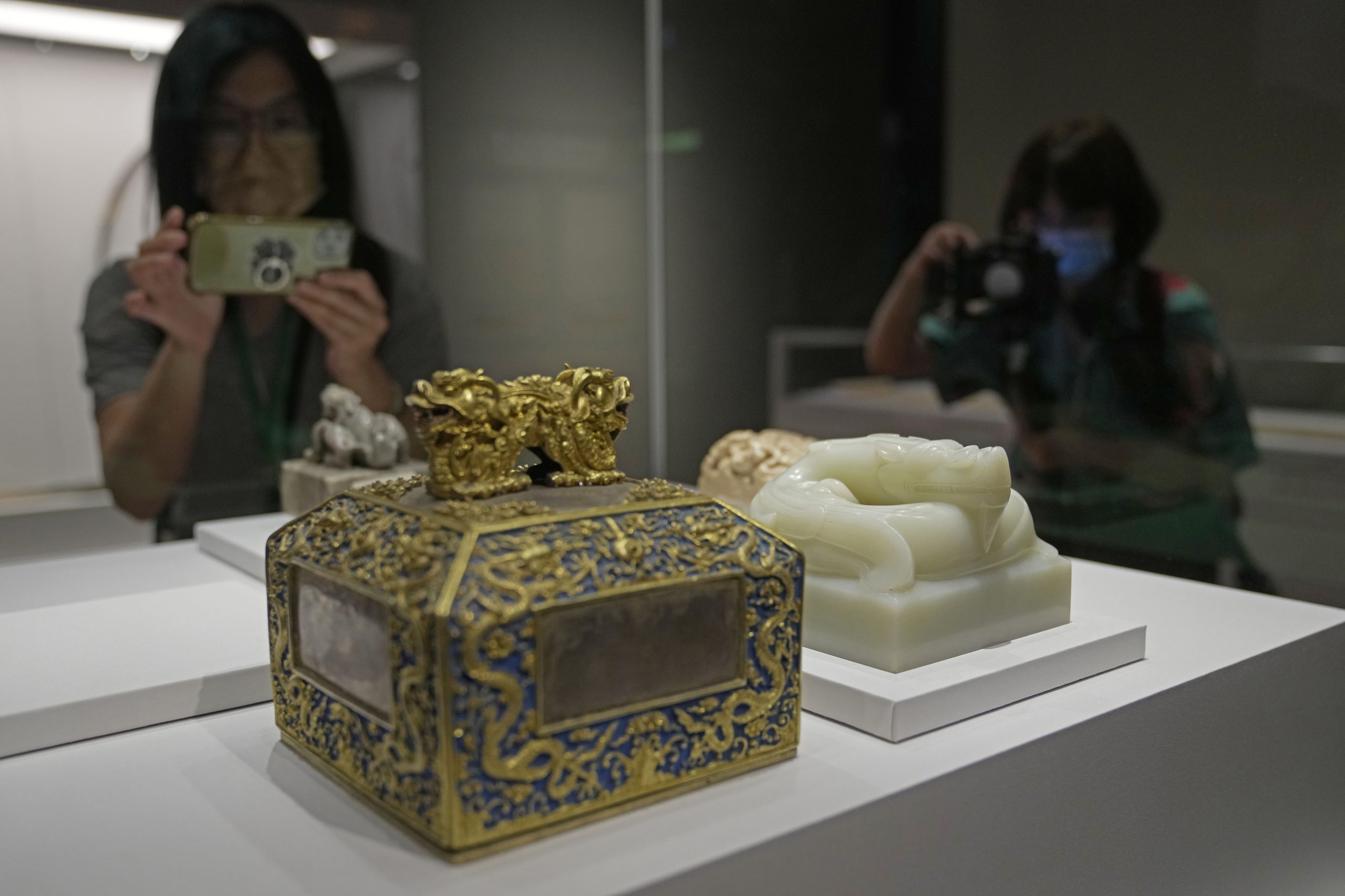 除了龙袍,皇权另一象征是玉玺,展厅1展出的盘龙纽“大清受命之宝”是皇太极时期所制玉玺,以满文及汉文刻有“大清受命之宝”字眼。