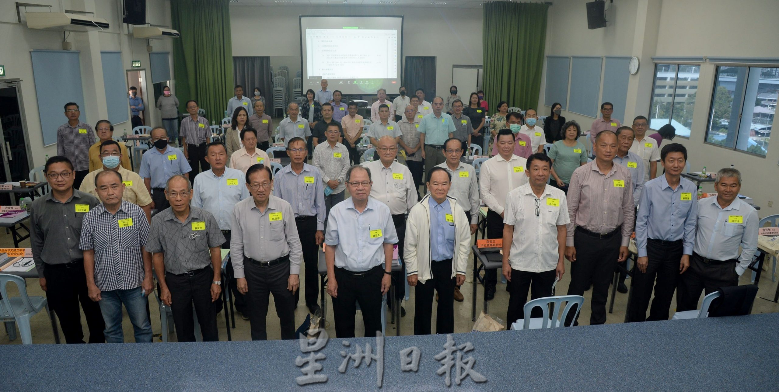 陈大锦(前排右五)在致词后,与出席者一起合照留念;左起为叶光威、谢瑶、蔡庆文和陈友信;右起为涂兴全、霹雳董联会颜登逸、庄俊隆和吴小铭。(林明辉摄)