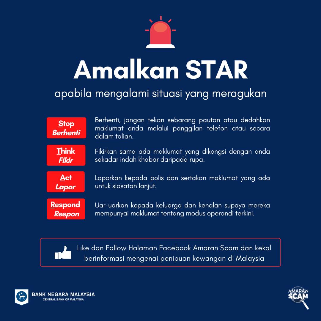 (八打灵再也25日讯)国家银行的“Amaran Scam”(诈骗警告)脸书专页提醒民众,勿被诈骗者的甜言蜜语欺骗,民众若遇到可疑情况应实践“STAR”公式。