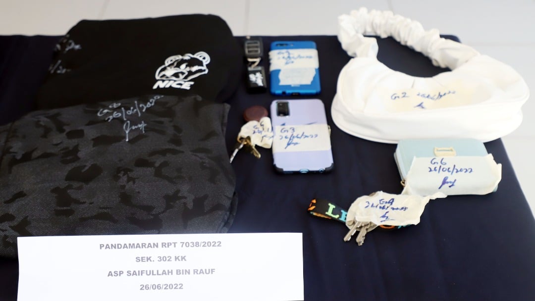 警方起获的谋杀案证物,包括16岁少女使用的手提袋和钱包,嫌犯和女友的手机、嫌犯衣服和车钥匙。(高建业摄)