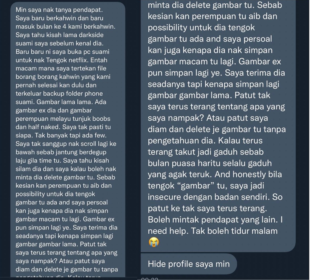 “我不知道到底该坦白说,还是装作不知道?但老实说,我看过这些照片后,我感到很不安,大家请给我一些建议,我如今夜不能眠,需要帮助。”
