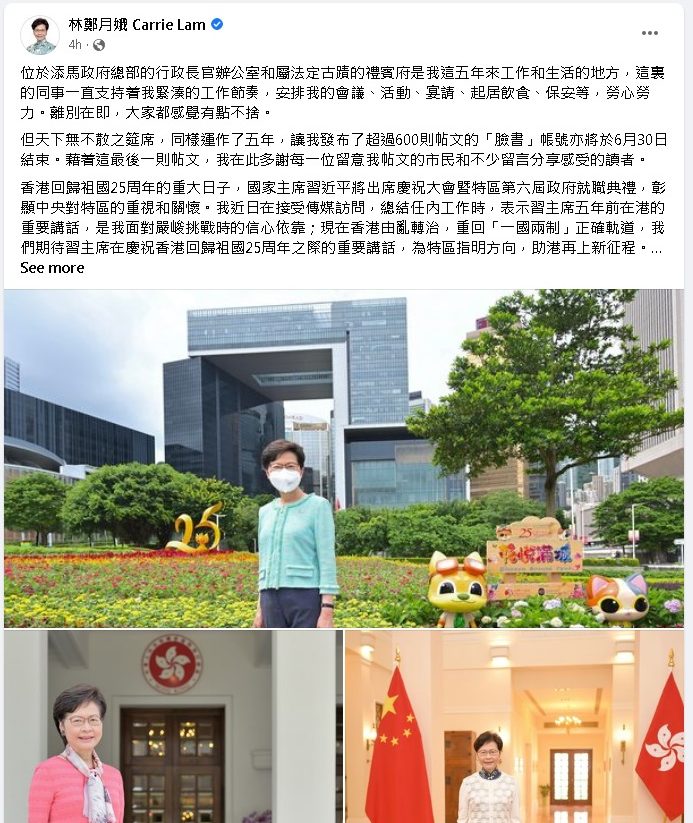 林郑在最后一则脸书帖文上载了她在政府总部添马公园以及在礼宾府的独照,提到政总的行政长官办公室和属法定古迹的礼宾府,是她5年来工作和生活的地方,她提到同事一直支持她紧凑的工作节奏,为她安排会议、活动、宴请、起居饮食、保安等,劳心劳力,离别在即,大家都感觉有点不舍。