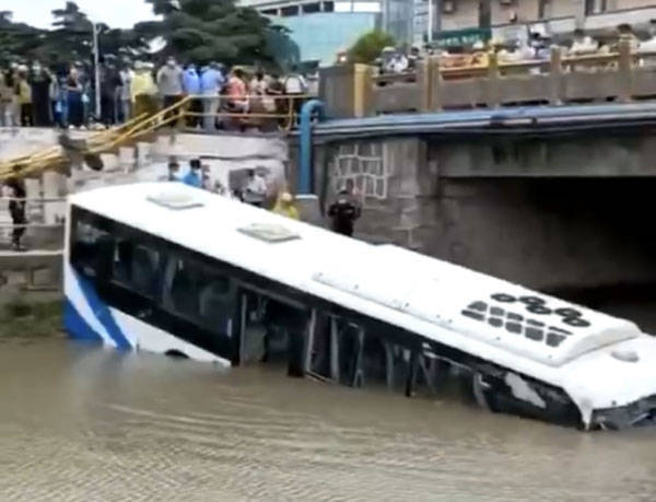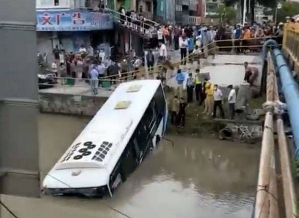 网传影片显示,一路口有多辆汽车停留,市民驻足围观,有人说“人民东路和南祝路交叉口红绿灯撞歪了”。另有影片显示,一辆公交车掉入河中,公交车车头已经冲到了河道中间,水已经淹没至驾驶室玻璃中间位置。公交车车身大半冲进河道,车身前端水位达车窗位置,仅车尾还在岸上。影片中公交车上仍有乘客,乘客集中至车尾。