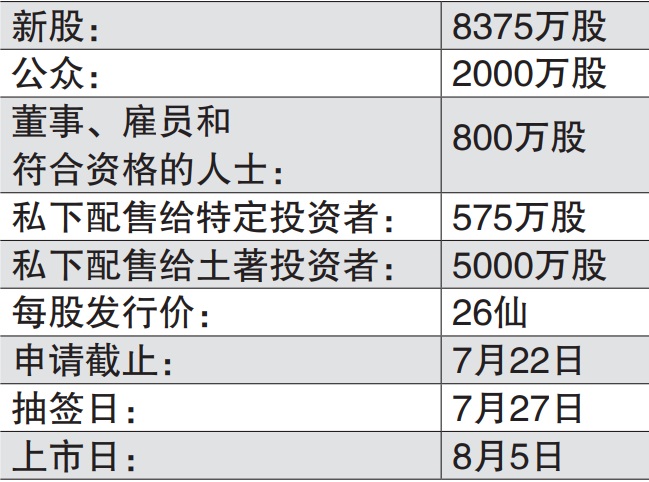在新股当中,2000万股公开发行给公众,800万股保留给公司合格董事、员工和对公司有贡献的个人,575万股私下配售给特定投资者,其馀5000万股私下配售给土著投资者。