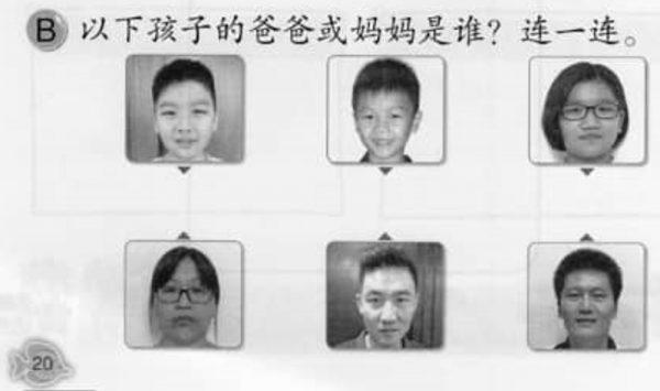 题一:以下孩子的爸爸或妈妈是谁?连一连。接着提供上下方三个小孩和三个大人的人头照,让学生为父/母和子/女连线配对。