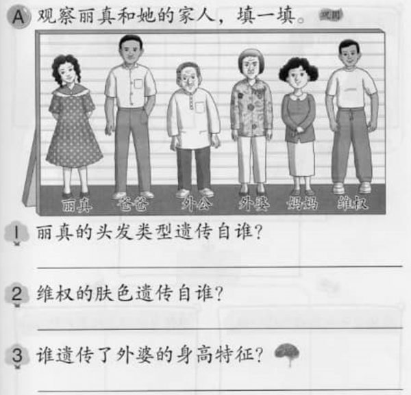 若为配合小二程度而把相关概念说成“身高遗传自外婆”或“肤色遗传自爸爸”,其实恰恰是遗传学领域的“伪科学”。因为人类的身体特征,包括标准课程和习题里的“肤色、眼睛颜色、头发类型、身高、脸型、耳垂”,都牵涉“多基因遗传”(polygenic inheritance),加上基因自由组合、基因间互动、基因连锁、交换、基因-环境互动(例:营养、运动)等遗传定律,还有隐性和显性等遗传表现,都使特征遗传变得很复杂。