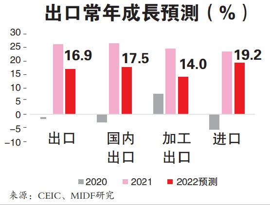 “然而,对外贸易依然面对多项潜在下行风险,包括中国城市封锁、俄罗斯—乌克兰冲突升级,或是全球需求因通膨风险和货币政策收紧而不温不火等。”