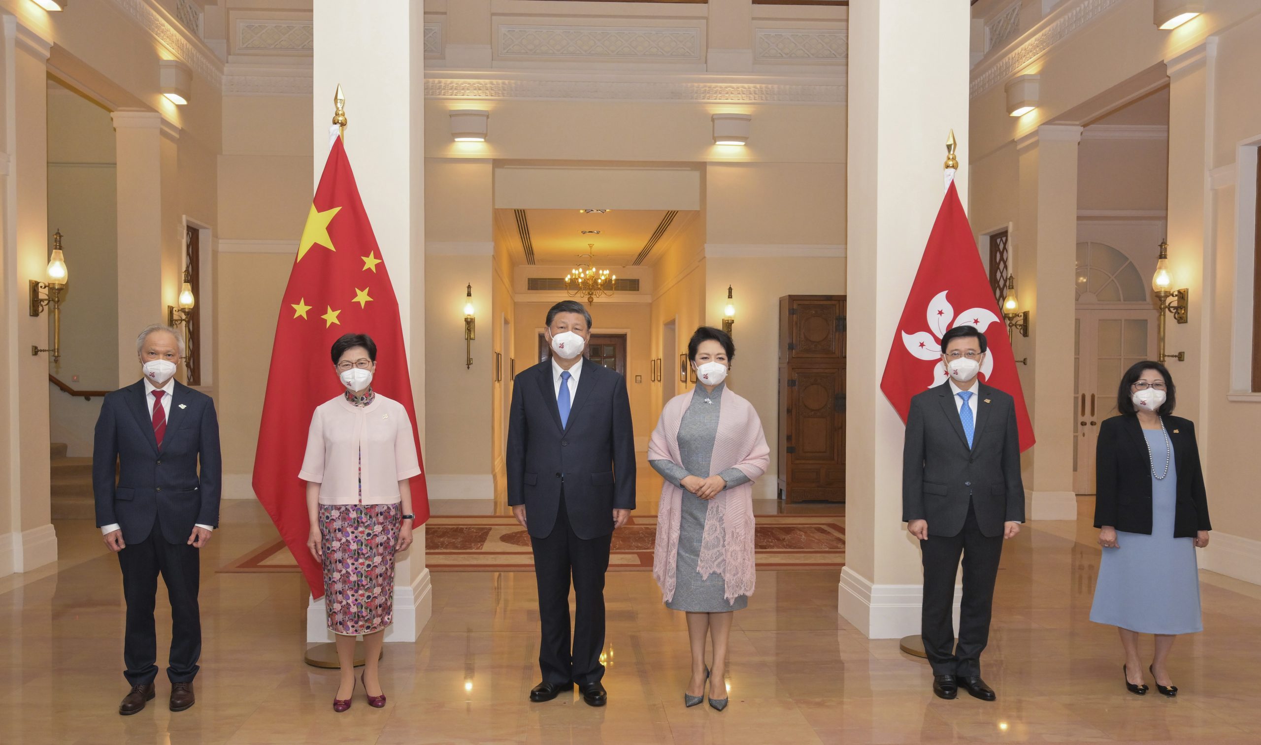 中国国家主席习近平(左三)和夫人彭丽媛(右三)周四晚在香港礼宾府和林郑月娥(左二)和丈夫林兆波,以及香港候任特首李家超(右二)和夫人林丽婵合照。(美联社照片)