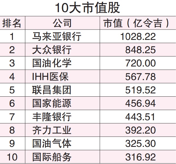 马来亚银行(MAYBANK,1155,主板金融服务组)仍然蝉联市值榜老大宝座,市值在一个月内减少5.6%或逾61亿令吉,至1028亿2200万令吉。