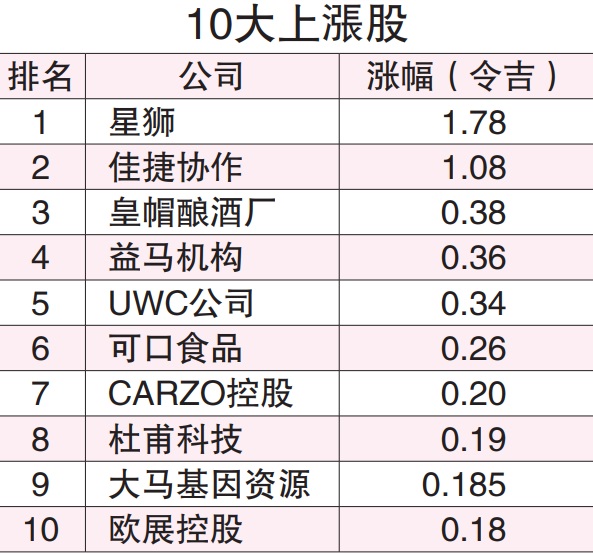可口食品也在被全购和私有化献议带动下,飙涨26仙,至1令吉45仙,接近1令吉50仙的全购价,为第六上涨股。