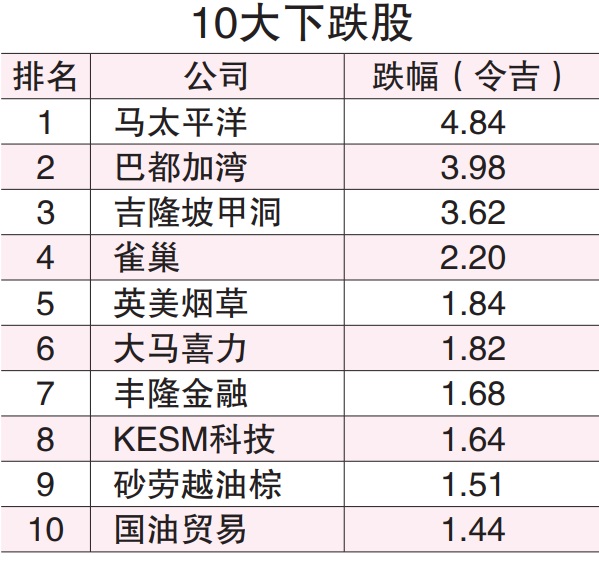 外资售股退场,蓝筹股蒙受卖压,雀巢(NESTLE,4707,主板消费产品服务组)跌2令吉20仙、英美烟草(BAT,4162,主板消费产品服务组)挫1令吉84仙、大马喜力(HEIM,3255,主板消费产品服务组)滑1令吉82仙、丰隆金融(HLFG,1082,主板金融服务组)降1令吉68仙。