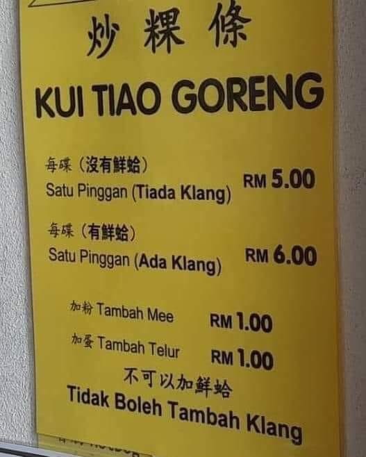 不过,在这份中巫双语价格表上,摊主所谓的“Klang”指的是炒粿条必备的鲜蛤,但是翻译错了。