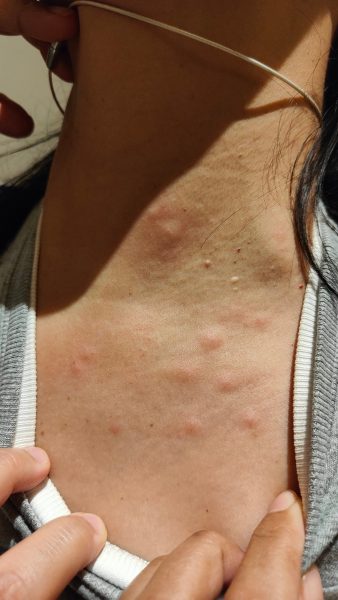 她说,第一次换房间是因为冷气发出巨响无法入睡,第二次则是因为被臭虫叮咬至全身红肿、布满咬痕。