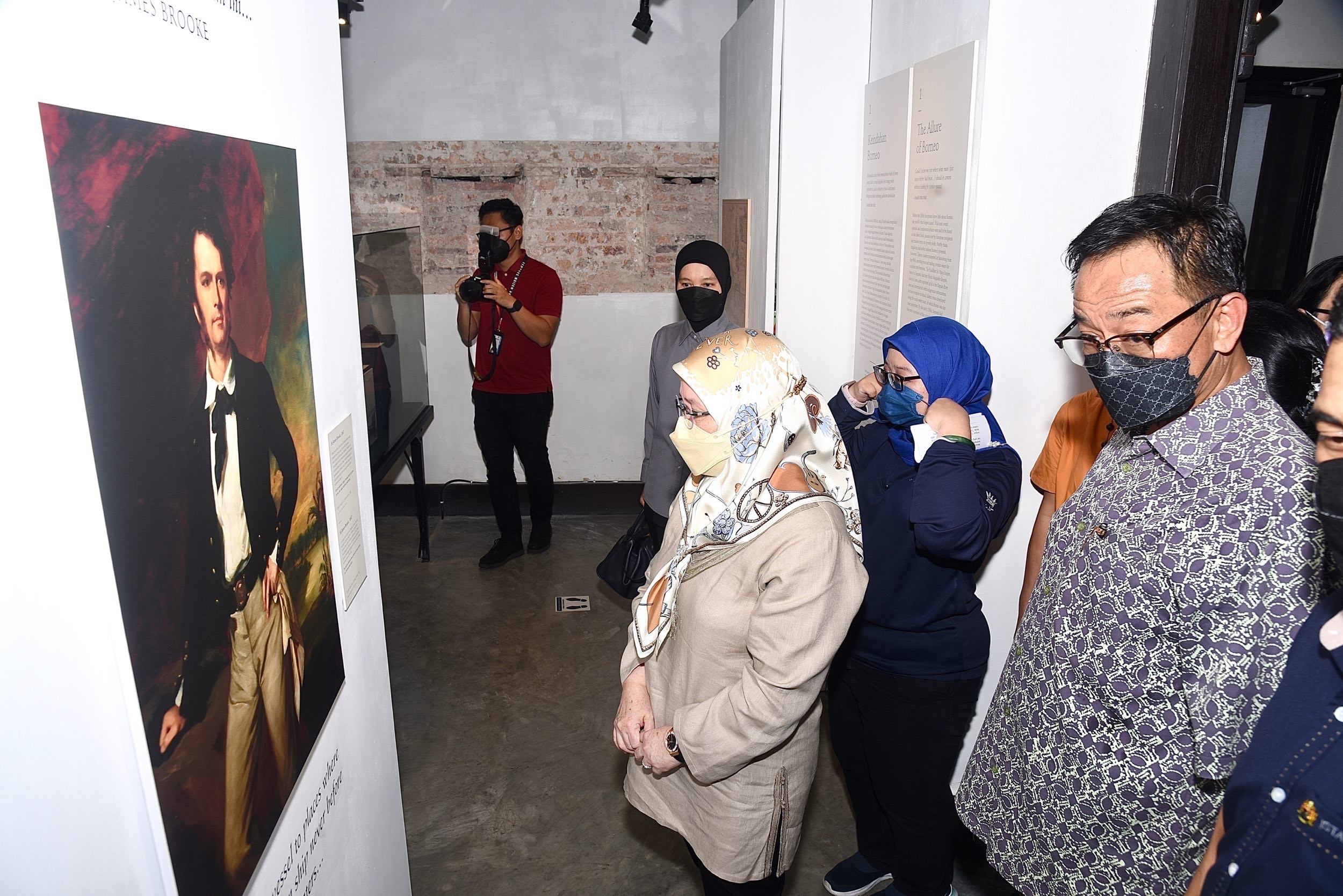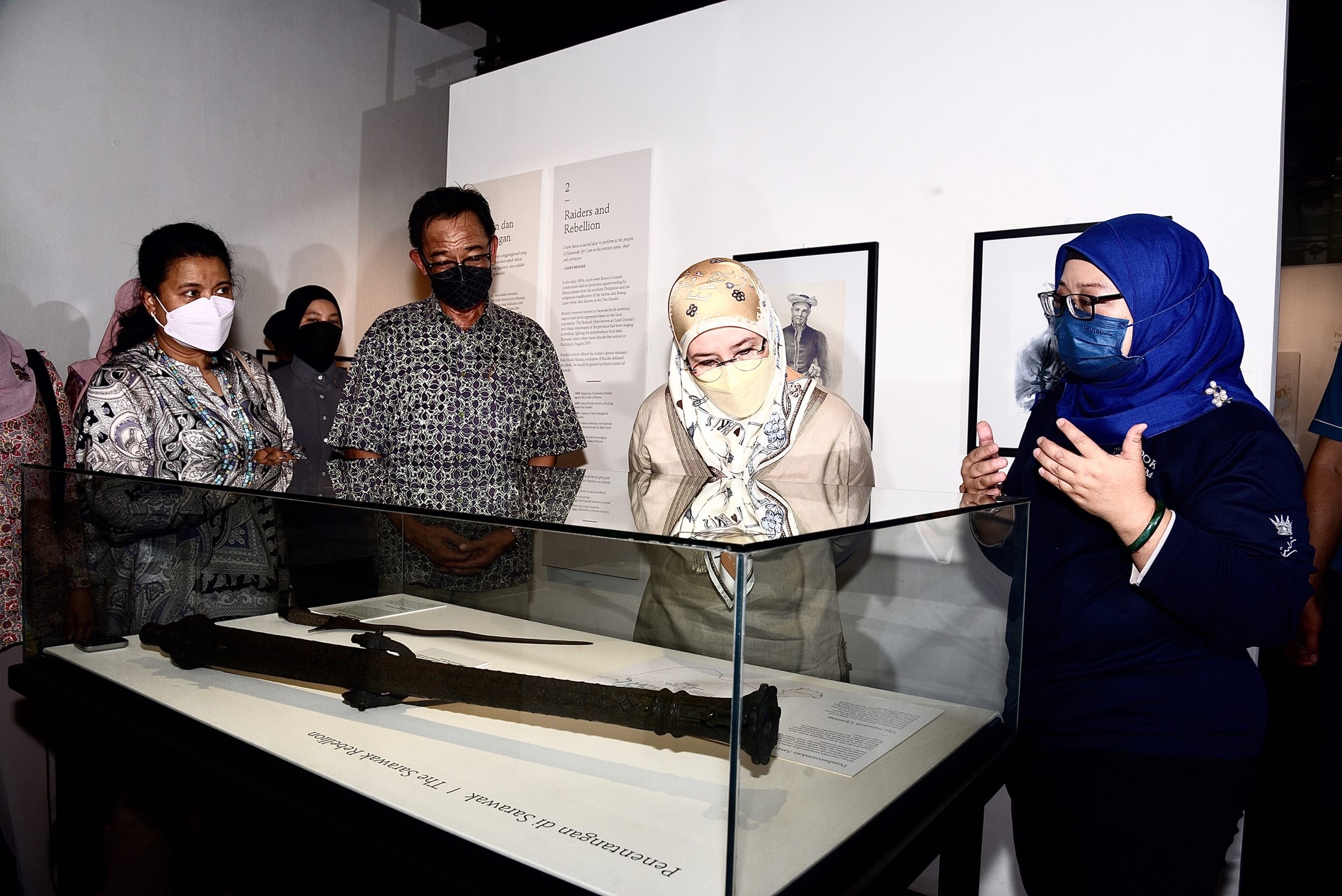 国家元首后东姑阿兹莎阿米娜(左)昨日下午前往布洛克博物馆参观,更进一步了解砂拉越在白人拉惹时代的历史,右为砂旅游、创意产业及表演艺术部长阿都卡林。(砂新闻局图)