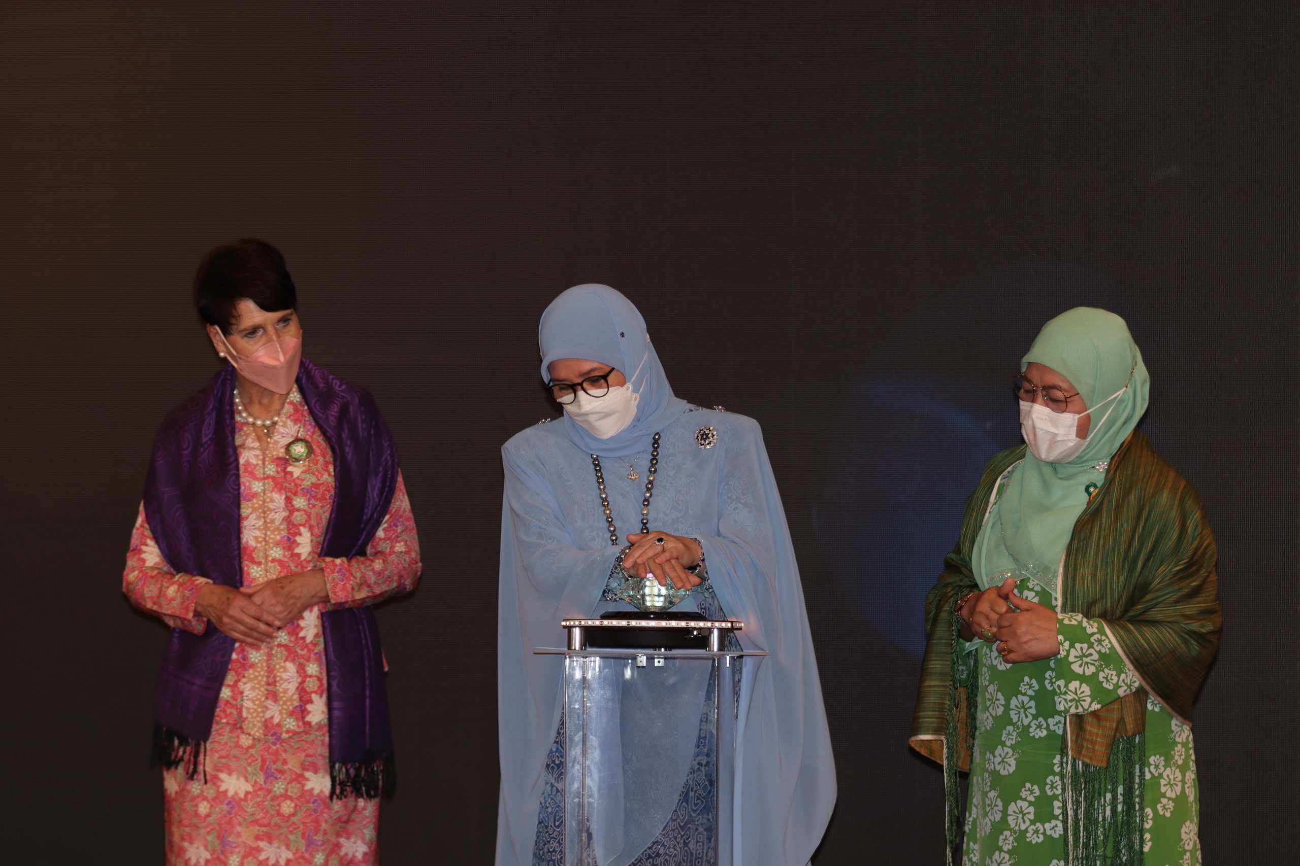 国家元首后东姑阿兹莎阿米娜(中)为第13届中亚及远东地区世界妇女协会大会主持推展礼;左为麦蒂,右为诺查娜。(砂总理署公关单位图)
