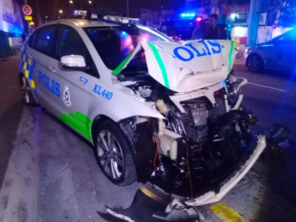 (吉隆坡6日讯)一辆警察巡逻车今晨追捕一辆拒绝停车接受检查的运动型多用途车时,发生3车连环相撞车祸,造成一名警员、多用途车司机和友人受伤,所幸伤势不严重,有关司机及友人事后被警方扣捕。