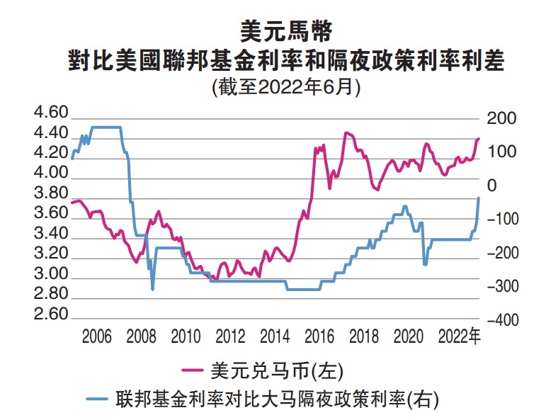 2006年至6月至2007年8月,美马利差扩大至175基点,当时美元兑马币平均3.55,与目前的贬至超过4.40有很大差别。