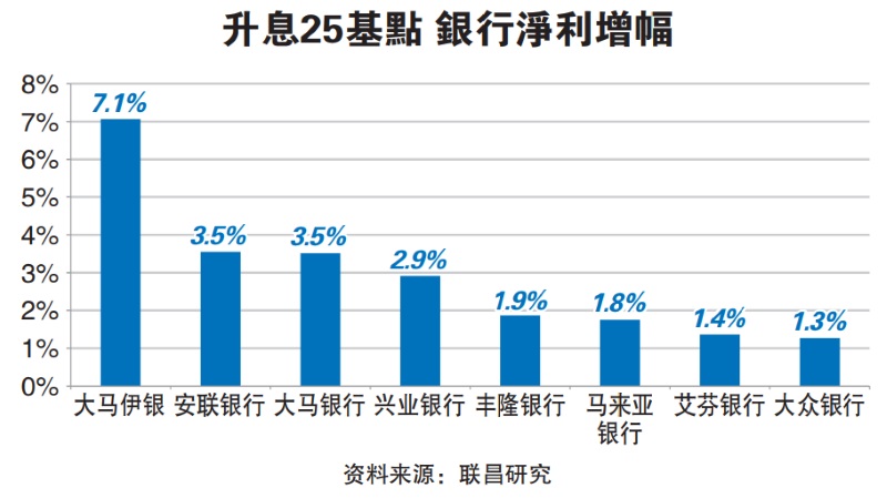 联昌研究预测25基点或0.25%的隔夜政策利率调升,可让国内银行业获得盈利约6亿3400万令吉,超越银行业因升息增加的额外1亿6300万令吉成本开销。