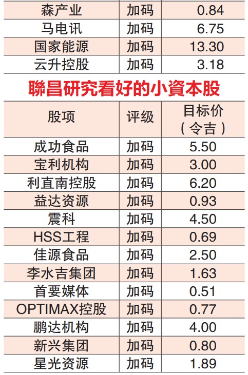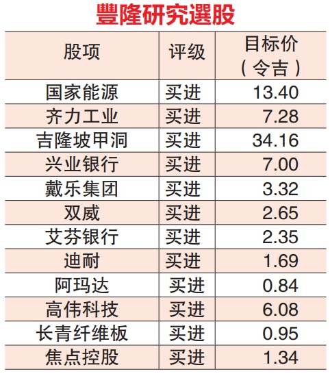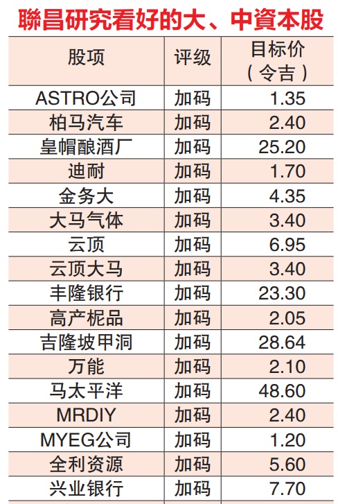联昌的首要选股兴业银行(RHBBANK,1066,主板金融服务组),目标价7令吉70仙;MRDIY(MRDIY,5296,主板消费产品服务组)2令吉40仙;云顶大马(GENM,4715,主板消费产品服务组)目标价3令吉40仙。
