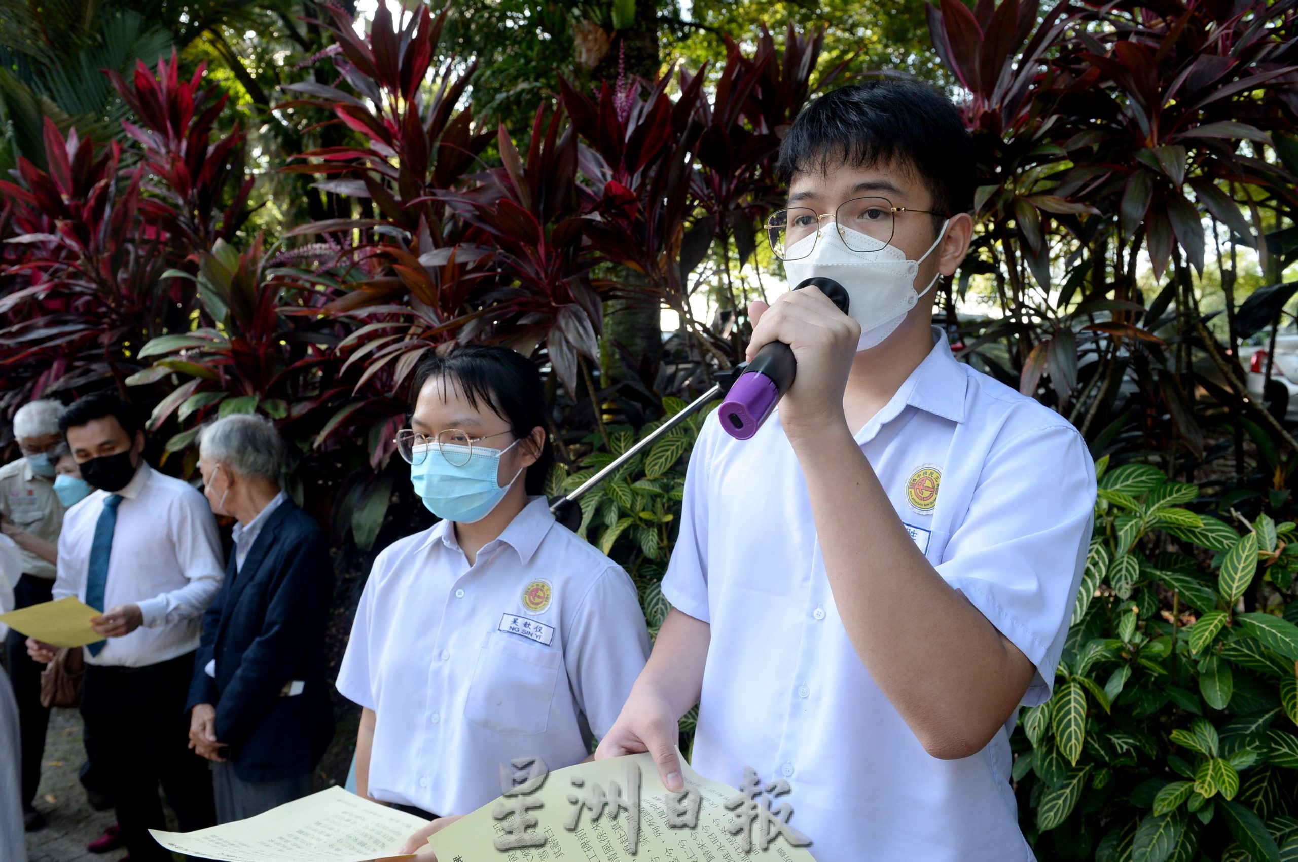 “南侨机工纪念碑七七公祭典礼”祭文由学生代表颜国胜和吴韵仪宣读。