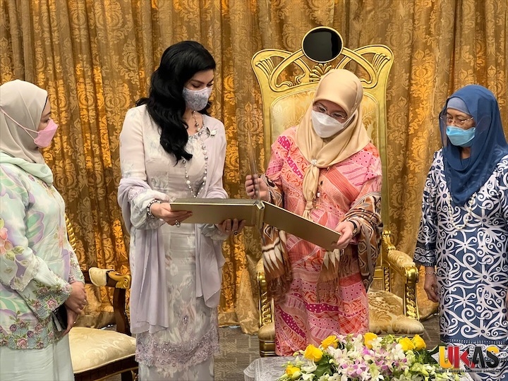 国家元首后阿兹莎阿米娜(右二)欣赏此次行程期间所拍摄的照片专辑;左起砂总理署副部长莎丽花哈西达及砂元首后拉嘉古迪泰益,右为砂总理夫人祖玛安妮。(砂总理署公关单位图)
