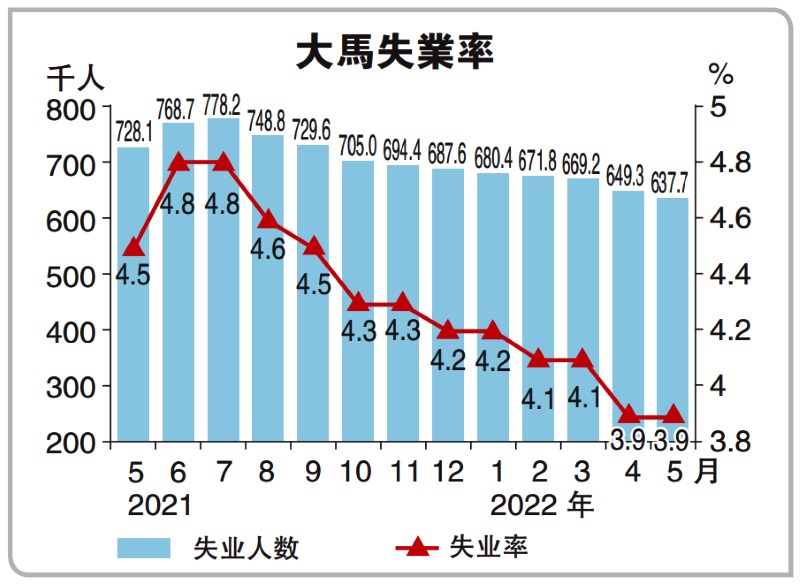 至于5月的失业情况,莫哈末乌兹尔说:“在失业总人数中,83.7%是可以工作、并且积极寻找工作者,这一领域下跌1.6%至53万4000人,4月则是54万2900人,以失业的持续时间,58.6%失业少过3个月,6.9%属于长期失业:超过1年。”