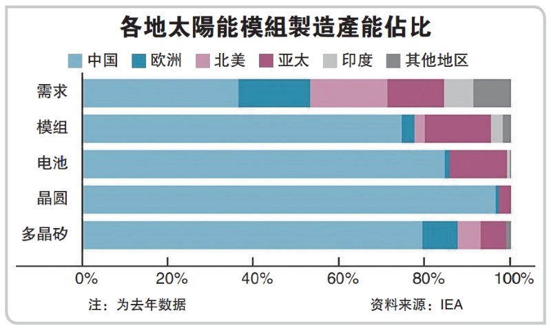 IEA表示:“到2025年时,全世界太阳能板关键性建构组件,几乎都将完全依赖中国供应。任何全球性供应链的密集度达到如此水平,都具有高度的脆弱性。”