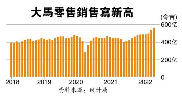 (吉隆坡8日讯)大马经济重新开放,以及开斋节假期刺激消费活动,5月销售额创下9年新高,录得1298亿令吉,按年成长19.9%;其中零售贸易更暴涨30%至563亿令吉,写下历来最高。