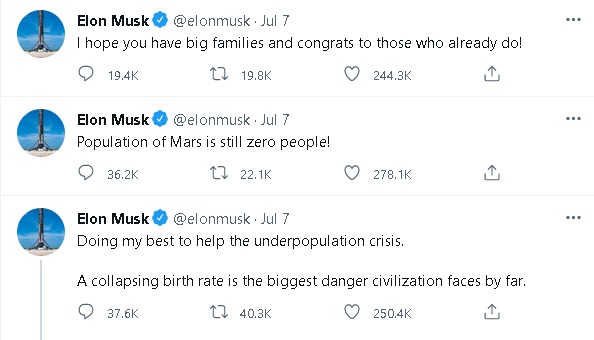 虽然没有直接回应上述传闻,但在周四推文中,马斯克用调侃的方式对人口问题发表看法称:“为人口不足危机尽一己之力。生育率下降是人类文明面临最大的危机。”