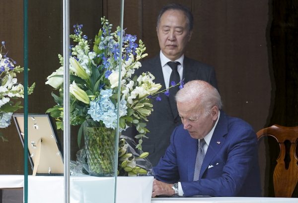 拜登周五亲自前往日本驻华盛顿大使馆进行吊唁,并在吊唁簿上签名留言。