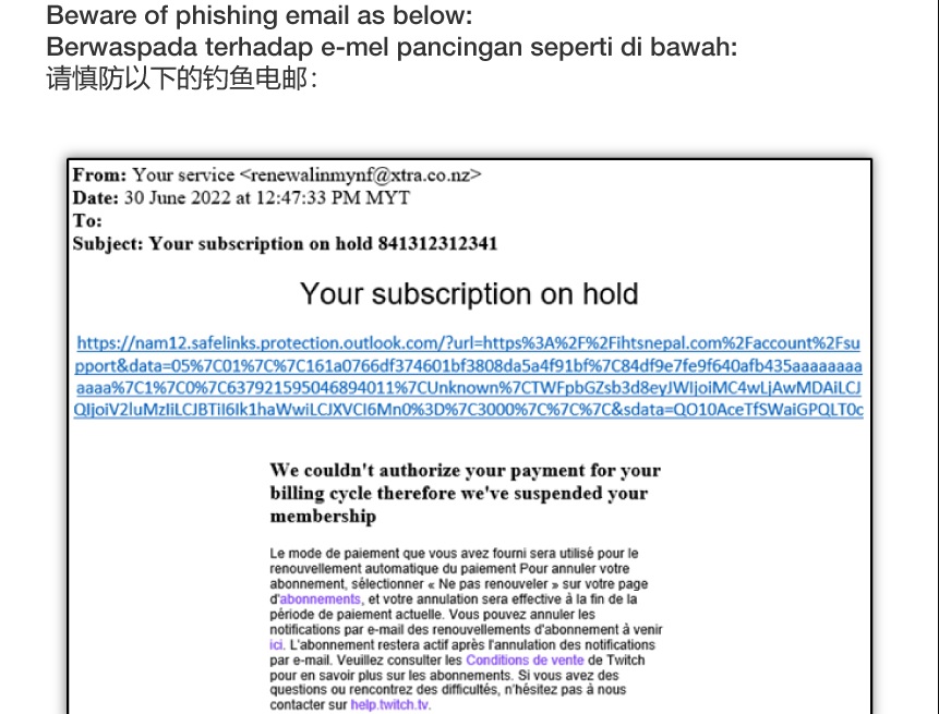 (八打灵再也11日讯)要是收到“我们无法授权你的账单周期付款,因此已暂停会员资格”的钓鱼电邮,民众可要慎防。