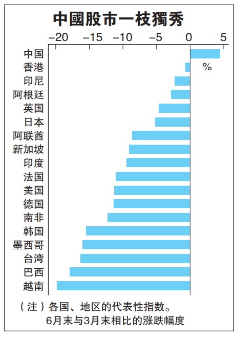 《日本经济新闻》统计了全球主要资本市场代表股指在4至6月份的表现,统计结果发现,A股(上证综指)在次季上涨了4.5%,列全球主要市场的第一位,唯一出现上涨的市场。