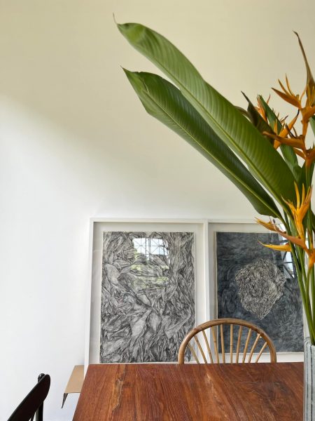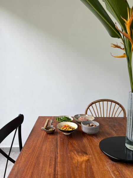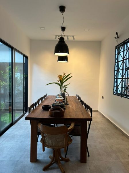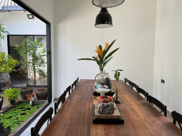 对于生活空间的想像,早在绘制平面图中,规划了一个连接厨房的长方形饭厅,沿着饭厅旁的落地玻璃窗推开,就是长长的鱼池,天井的绿植尽收眼底,伴着水声和流动的风,幻想自己在某个度假村用餐。为了达到这样的氛围和效果,长条形的饭厅需要一张加长版的饭桌才行,但是为了寻获一张合适的饭桌还真不容易,除了价格昂贵之外,市面上要找超过4米的饭桌可煞费苦心。