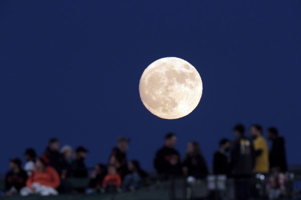 当地时间周二晚,在美国三藩市(或称旧金山)一场棒球比赛中,一轮皎洁的明月在球迷身后升起。(美联社照片)