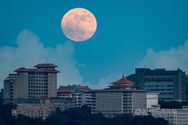 台北市立天文馆表示,这次月亮将比平常大又亮。图为超级月亮高挂在台北文化大学校区上方空。(中央社照片)