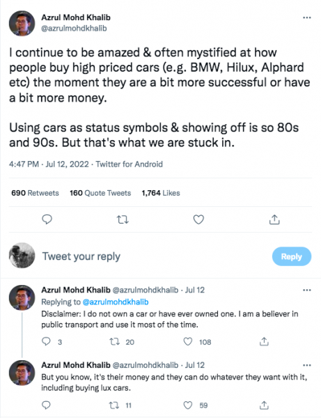 他写道:“那些有了成就或有多一些钱的人,会选择购买昂贵车子(如宝马、丰田Hilux、Alphard等),我仍旧对此感到惊讶和困惑。