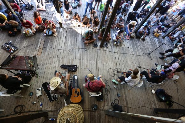 乐手间互相切磋技艺,或即兴来一段合奏或表演,观众一起手拉手、集体跳舞,场面充满世界大同和谐的气氛。
