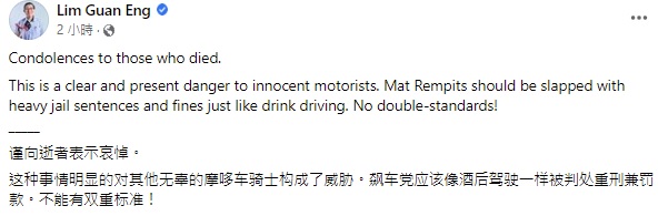 行动党主席林冠英今午也在脸书哀悼死者,并认为飙车党应该像酒后驾驶一样,被判处重刑兼罚款,不能有双重标准。