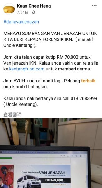 他说,他于今年6月27日,在其脸书发起一项筹款购买棺材车活动,希望能筹获14万令吉;惟于7月2日,就已停止向外筹款。