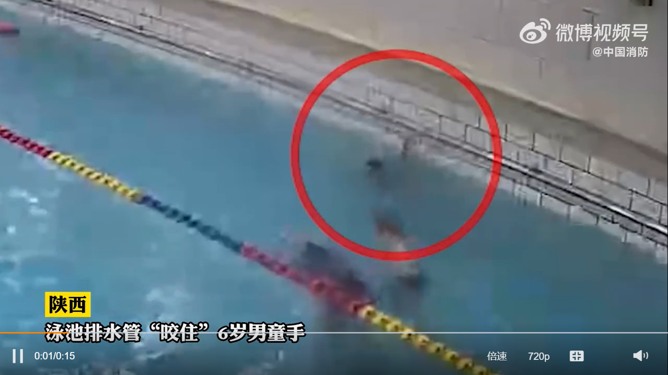 (陕西20日讯)中国陕西一名男童在泳池游泳时,手臂被排水口紧紧吸入无法自拔,视频曝光引发热议!