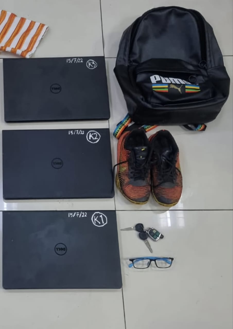 “警方随后也搜查嫌犯位于甲洞蓝图园商业区的住家及轿车,起获相信是赃物的3台手提电脑以及一双名牌球鞋。”