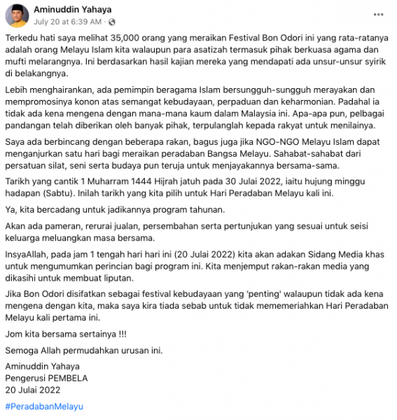 (八打灵再也22日讯)伊斯兰捍卫者组织(Pembela)主席阿米努丁对于众多穆斯林参加日本盆舞节(Bon Odori)感到惊讶,并宣布于7月30日举办“马来文化节”。