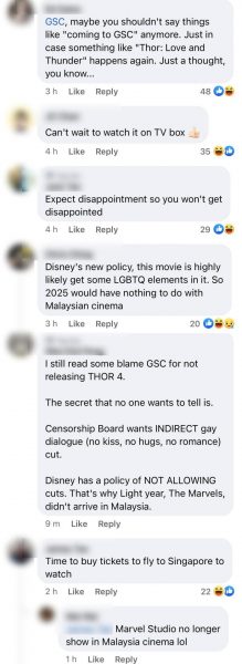 大马网民在GSC官方脸书吐槽接下来的漫威超级英雄片会否像《雷神4》一样因各种客观因素无法在本地上映。(脸书截图)