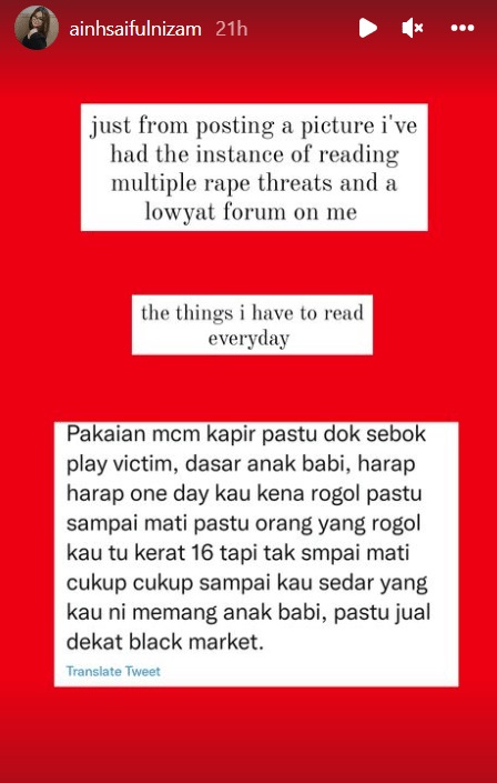 (八打灵再也24日讯)在课堂上揭发教师开强奸玩笑的艾因近日在社交媒体分享生活照后,收到网民的强奸威胁信息,令她感到不安及害怕,甚至自我厌恶。