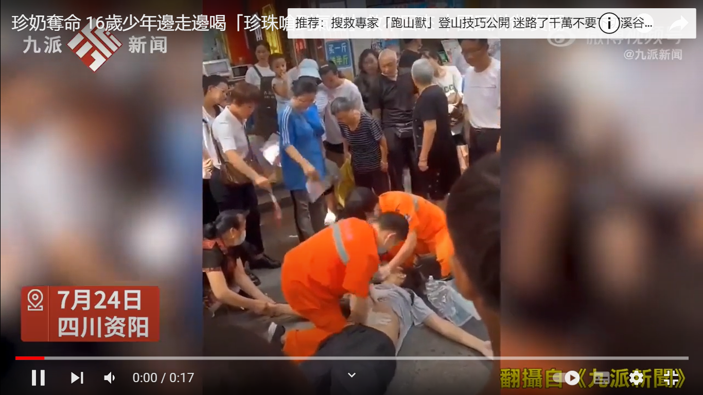 (四川25日讯)中国一名少年喝奶茶时,疑珍珠呛到气管,当街窒息倒地抢救无效身亡。