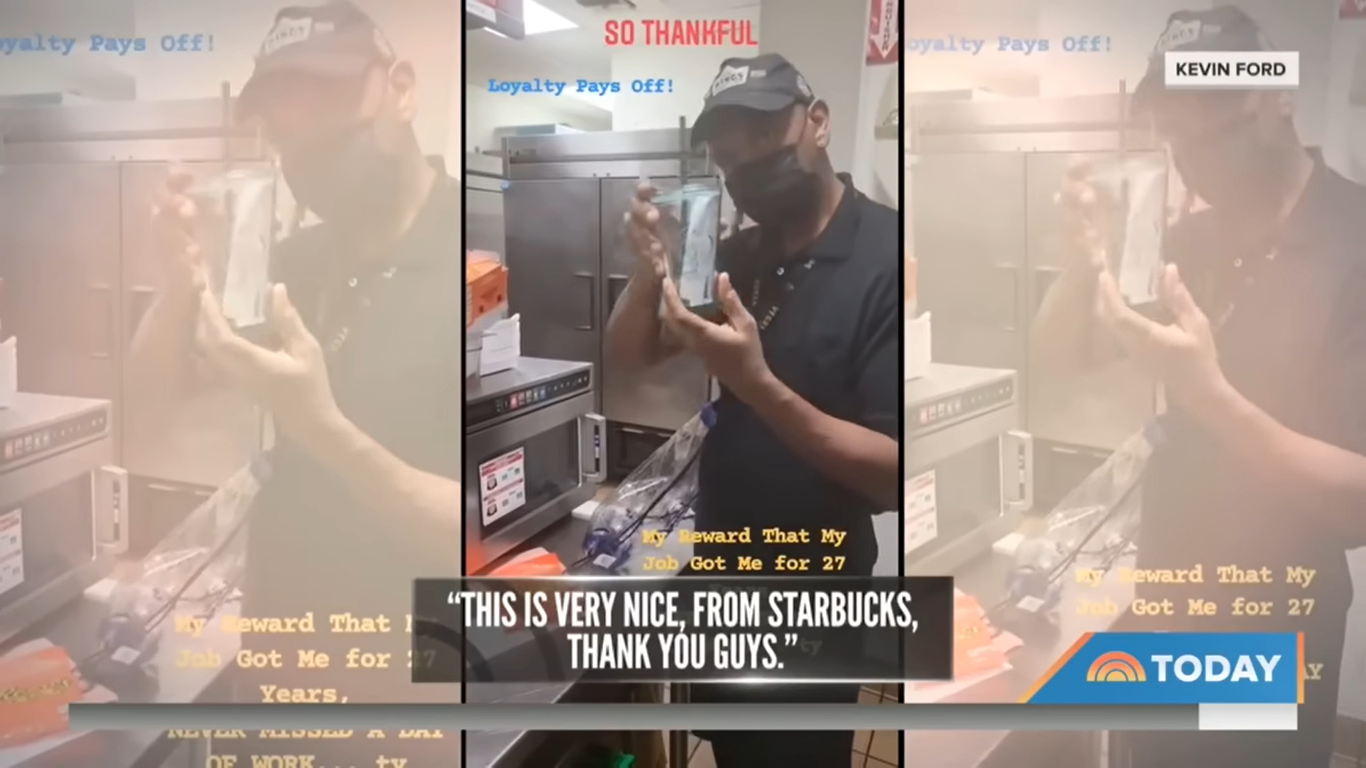 综合外媒报道,54岁凯文福特在拉斯维加斯麦卡伦机场的快餐分店工作,他近日向管理层透露他已经服务了27年,这让同事们都相当震惊,同时决定送礼物给他以表达感激之情。
